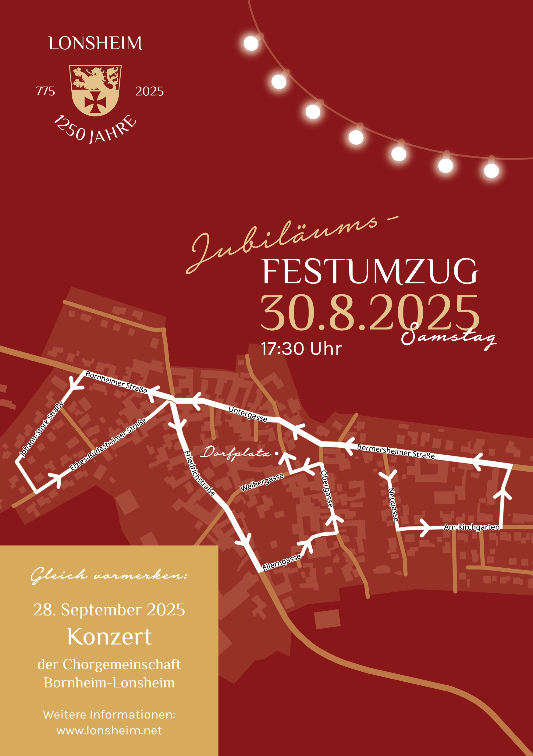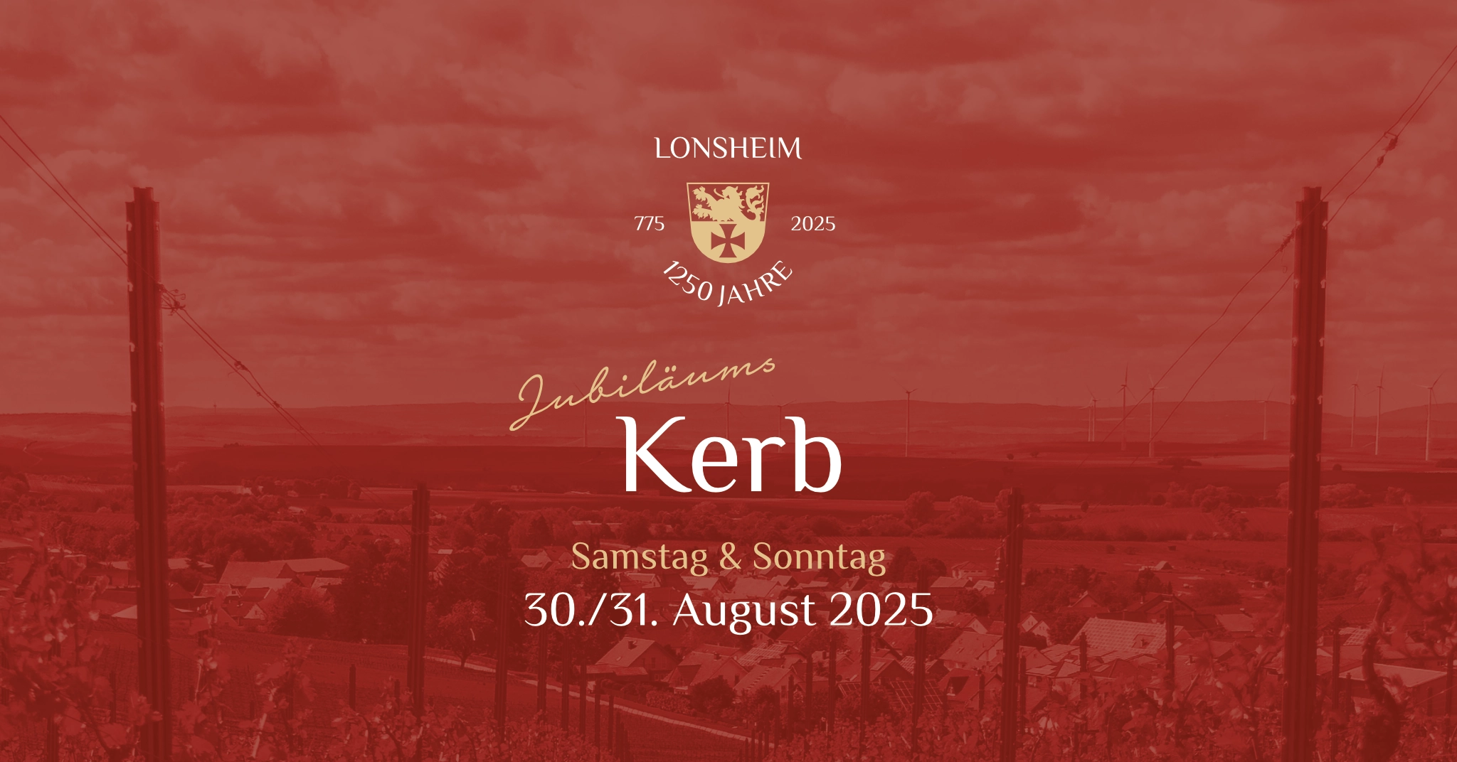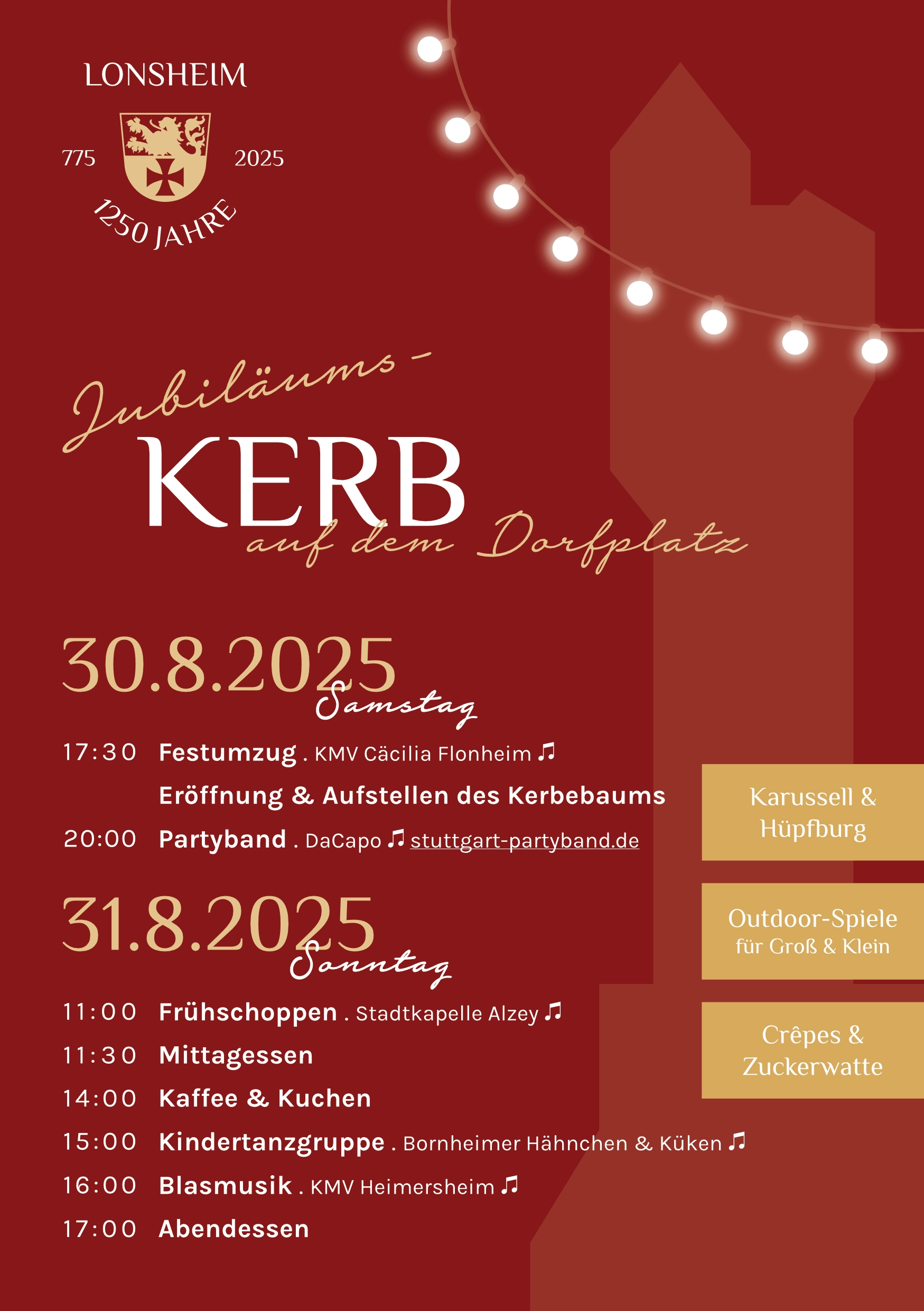 am letzten August-Wochenende erwarten uns wie in jedem Jahr wieder zwei Tage Lonsemer Kerb voller Geselligkeit, Musik und bester Stimmung auf unserem schönen Dorfplatz. Anlässlich unseres Jubiläums 1250 Jahre Lonsheim dürfen wir uns 2025 auf besondere Highlights freuen: